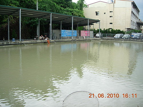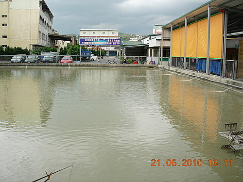 釣場說真的還蠻特別的,因為他周圍都是噴水的水管,場地還不錯很整齊也很乾淨,但就跟很多市區的海釣場一樣,有個不矮的高岸,坐在上面真的有點給他小怕怕!!池水偏黃,但是聽人家說老闆很注意水質,應該不會有土味才是!!